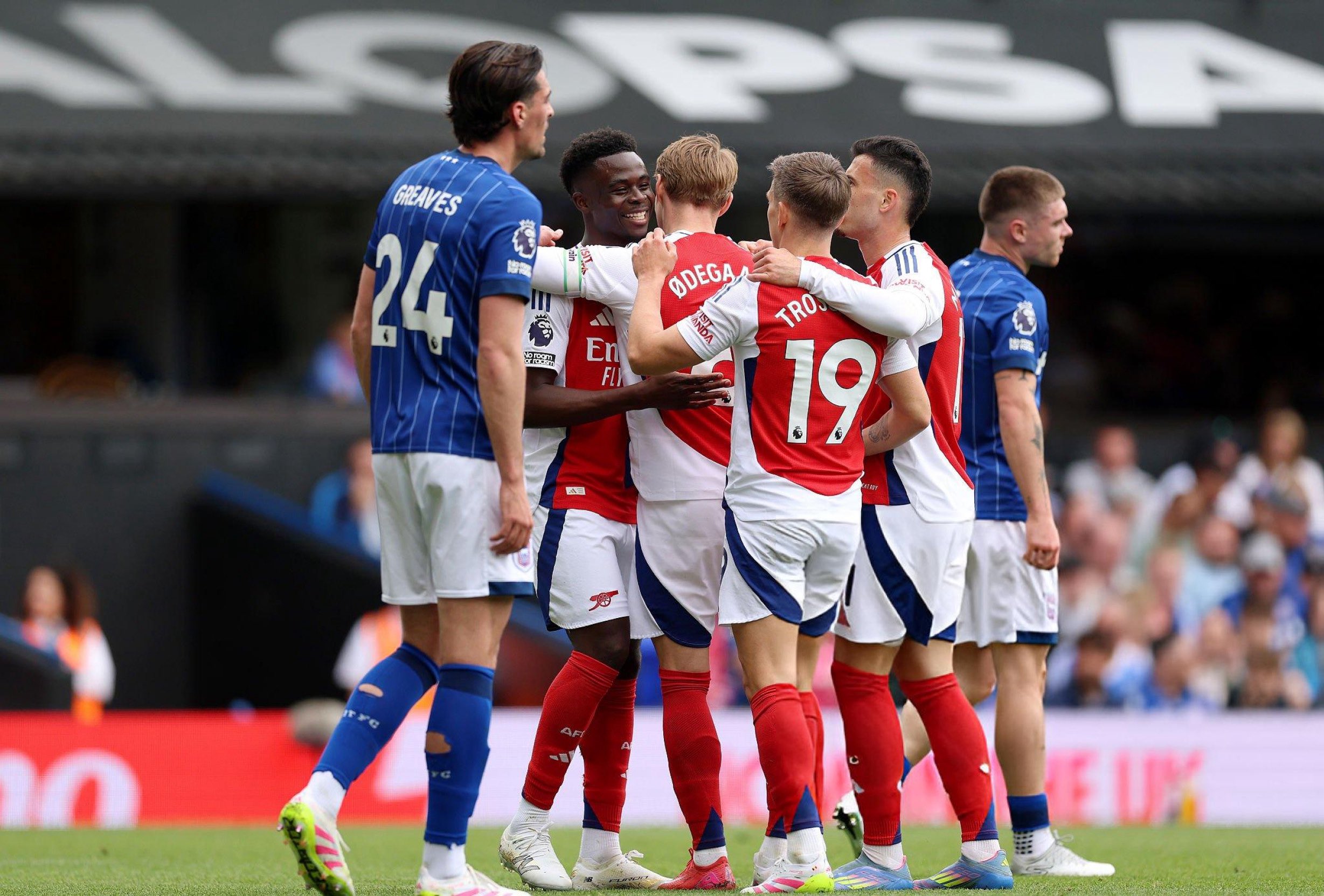 آرسنال در ضدحملات در ورزشگاه پورتمن رود فوتبال روانی به نمایش گذاشت، اما بازیکنان کلیدی این تیم با تکلهای خشونتآمیز بازیکنان میزبان که برای بقا میجنگیدند، مواجه شدند. در میان آنها، بوکایو ساکا، ستاره تیم، به شکلی زننده توسط لیف دیویس سرنگون شد؛ خطایی خطرناک که به درستی منجر به دریافت کارت قرمز مدافع چپ ایپسویچ در دقیقه ۳۲ شد.